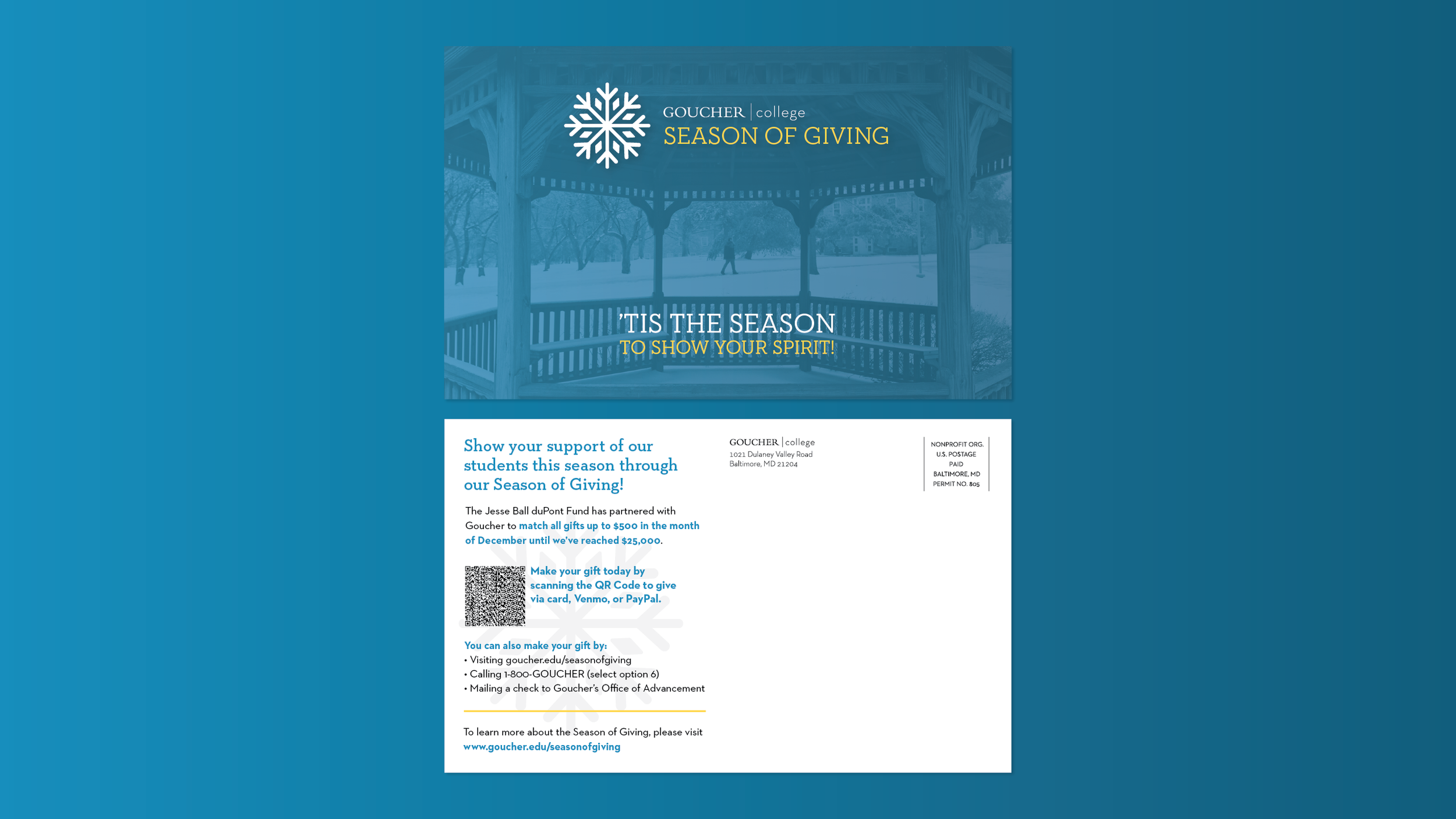 Season Of Giving Branding, postcard and email communication for the Goucher College holiday giving campaign.